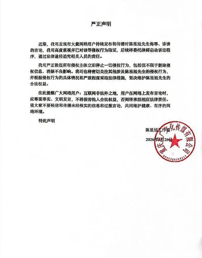 然而,温暖幕布的另一侧,是必须直面寒流的现实。同一天,陈星旭工作室发布严正声明,将另一番景象置于公众眼前。声明明确指出,近期发现大量网络用户在多平台持续发布针对陈星旭的侮辱、诽谤言论,尤其在《轧戏》播出期间集中爆发,内容涉及恶意造谣与人身攻击,严重侵害其名誉权。工作室态度坚决:法治时代,绝不姑息,已完成全量取证并委托律师启动诉讼程序,追究法律责任。
